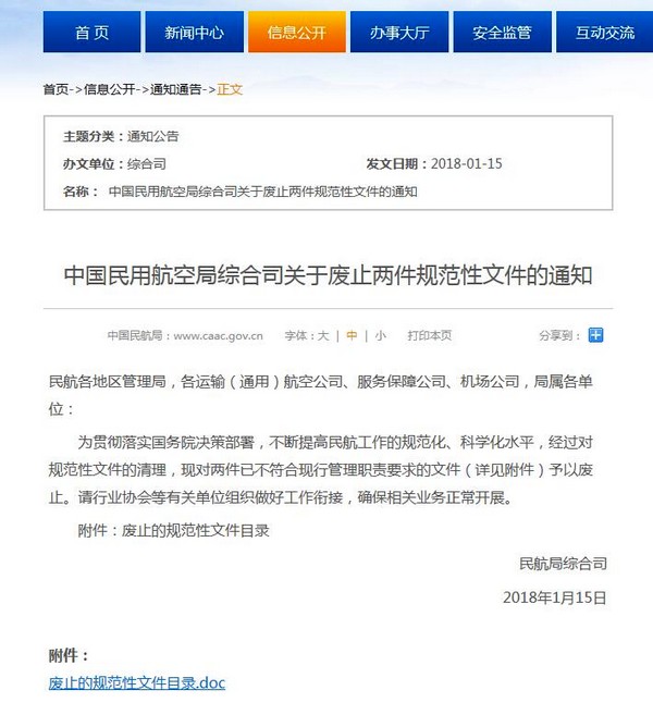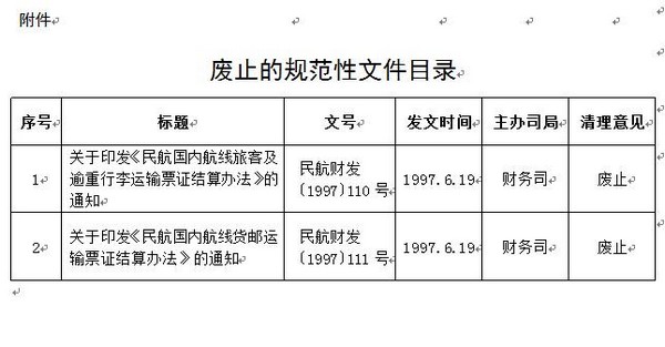 中国民航网讯:中国民航局官网1月15日发布《中国民用航空局综合司关于废止两件规范性文件的通知》。 通知内容为:为贯彻落实国务院决策部署,不断提高民航工作的规范化、科学化水平,经过对规范性文件的清理,现对“关于印发《民航国内航线旅客及逾重行李运输票证结算办法》的通知”与“关于印发《民航国内航线货邮运输票证结算办法》的通知”两件已不符合现行管理职责要求的文件予以废止。
