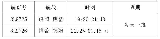 祥鹏航空绵阳=博鳌航班号为8L9725/26,每天一班,具体航班信息如下: