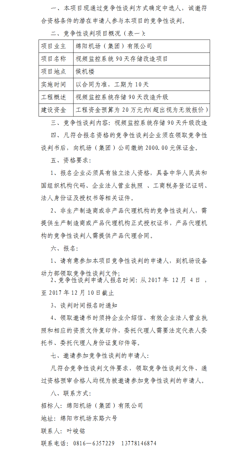 绵阳机场(集团)有限公司关于视频监控系统存储90天改造项目竞争性谈判二次公告